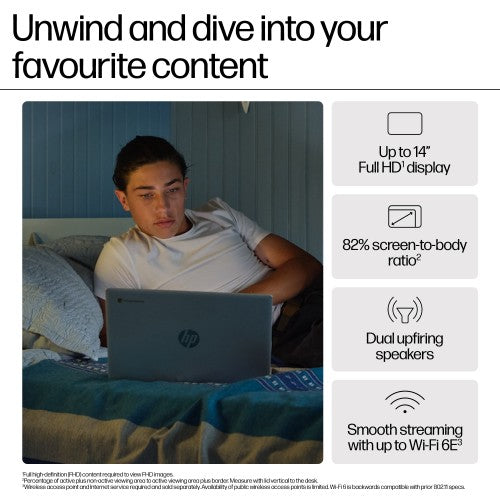 HP Chromebook 14a-nf0002sa Intel® N N100 35.6 cm (14") HD 4 GB LPDDR5-SDRAM 128 GB Flash Wi-Fi 6E (802.11ax) ChromeOS Grey