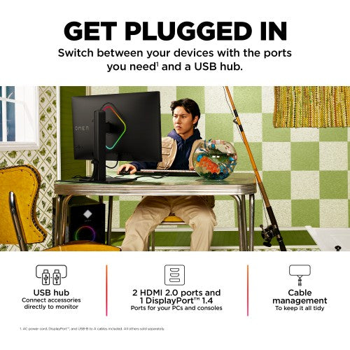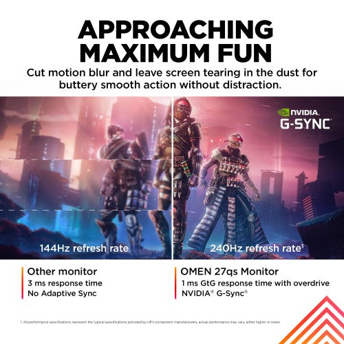 SPEED RUN THROUGH FUNOutclass the competition with the OMEN by HP 27-inch QHD 240Hz Gaming Monitor. Delivering ultra-smooth frames and crisp details[1], this NVIDIA G-SYNC compatible display has what it takes to keep up with you. Speed meets looks with a fun, yet refined design unlike any other so you can enjoy it in and out of the game.