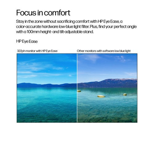 - Stay in the zone without sacrificing comfort with HP Eye Ease, a color-accurate hardware low-blue light filter, and height and tilt adjustability.