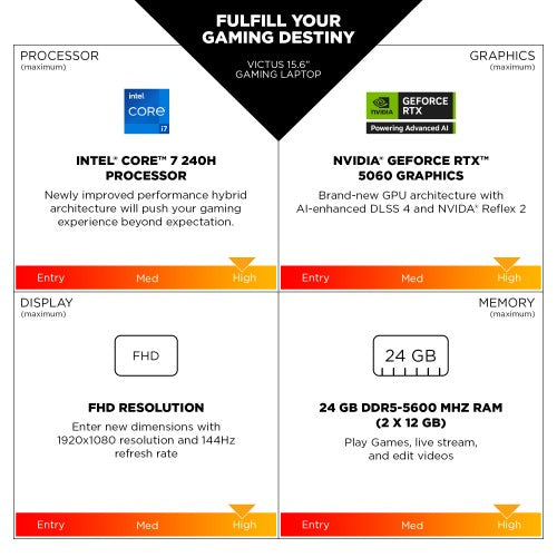 Follow your gaming destinyThe HP Victus Laptop is made for great PC gaming on the go. This sleek machine touts a powerful Intel Processor[1] and NVIDIA graphics. This laptop’s design is just as impressive as its hardware with plenty of color options[2], updated thermals and a webcam camera with Temporal Noise Reduction.
